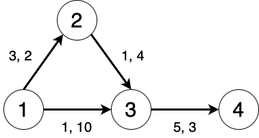 JOI 王国の都市と道路の様子を図にすると以下のようになる. 丸は都市を,矢印は道路を表し,各道路の横にはその道路の Li と Ci の値がこの順に書かれている. なお,丸の中に書かれた数字はその都市の番号を表す.