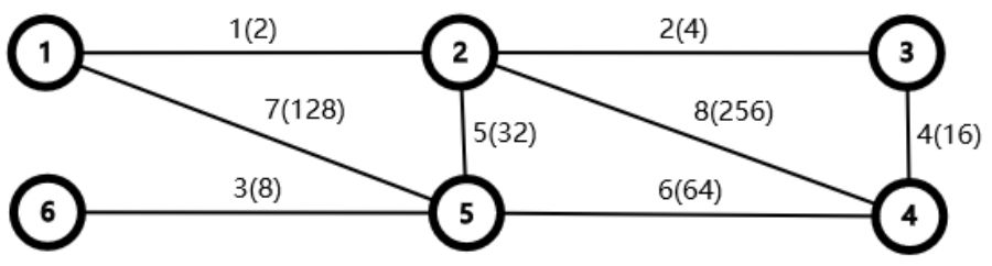 The first sample test case is shown below. The integers beside the edges are their indices (outside the parentheses) and lengths (inside the parentheses). The simple cycle with the smallest length consists of edges $2$, $4$, $5$ and $6$ with a length of $2^2 + 2^4 + 2^5 + 2^6 = 116$.