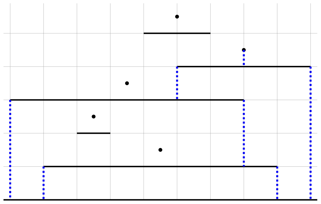 Półki w firmie Mati i spółka można dla uproszczenia reprezentować za pomocą odcinków na płaszczyźnie. Każda półka jest odcinkiem między pewną parą punktów (li, hi) i (ri, hi). Kraniki zamontowane przez hydraulika są punktami o współrzędnych ((li + ri)/2, hi + 0.5). Podłoga w tym pomieszczeniu jest reprezentowana poprzez oś OX.
