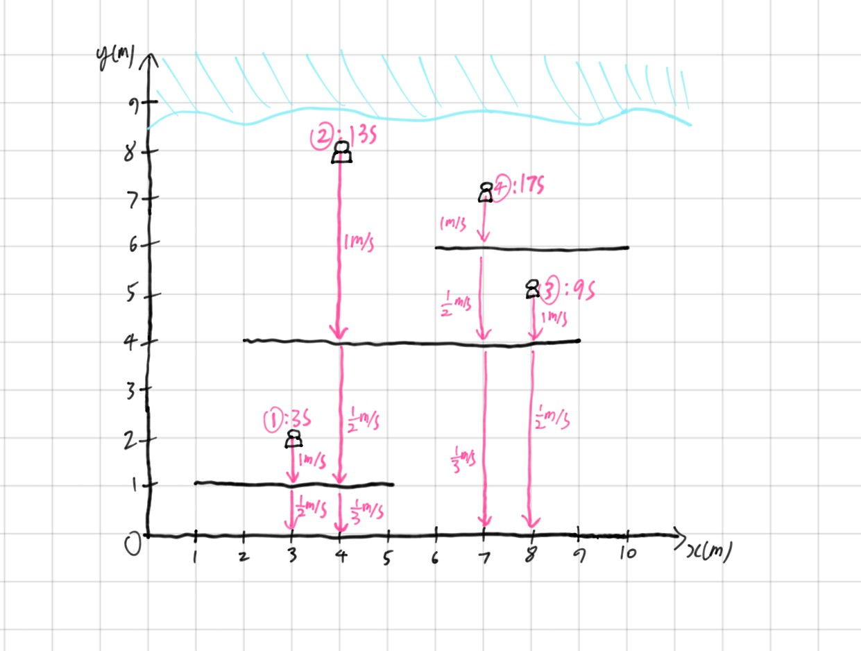 모든 사람은 벽에 닿을 때마다 속도가 감소한다. 선분의 끝점에 닿는 것도 벽에 닿는 것으로 간주한다. 벽에 닿기 전 속도가 $\frac{1}{n}$이었다면, 벽에 닿은 후의 속도는 $\frac{1}{n+1}$가 된다. 즉 $1$칸을 이동하는 데 걸리는 시간이 $1$만큼 늘어난다. 모든 $y$좌표는 겹치는 것이 없다. 즉, 모든 사람과 벽의 $y$좌표는 모두 다르다. 따라서 초기 사람의 위치가 벽과 겹치는 일이 없다. $x$좌표는 같을 수 있음에 유의하라.