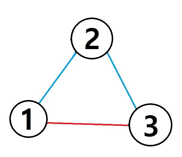 위의 세 그림은 각각 예제 $1$의 그래프 $G$와 $G$에 첫 번째 질의를 시행한 그래프, $G$에 두 번째 질의를 시행한 그래프이다. 파란색으로 색칠된 간선이 활성화된 간선, 빨간색으로 색칠된 간선이 비활성화된 간선이다.