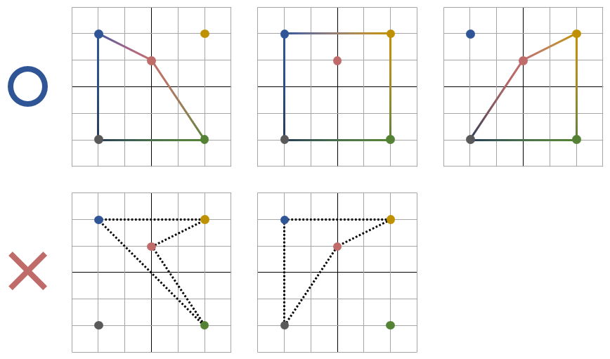 굴의 위치는 좌표평면 위 점으로 나타낼 수 있다. 기하학을 좋아하는 도깨비는 가면을 숨긴 $4$개의 굴을 적절한 순서로 이으면 볼록한 사각형이 만들어지게 할 것이다. 이 문제에서 볼록한 사각형이란 $4$개의 변이 꼭짓점에서만 만나며 내각의 크기가 모두 180° 미만인 사각형을 말한다.