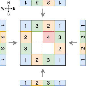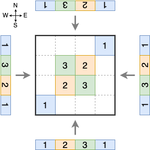 You are interested in the views from four directions, north, south, east, and west. When seen from one direction, n frontmost houses can be seen, lined up from left to right. Your goal is to build and paint the houses so that the n frontmost houses seen from all the four directions are in the same specified color order.