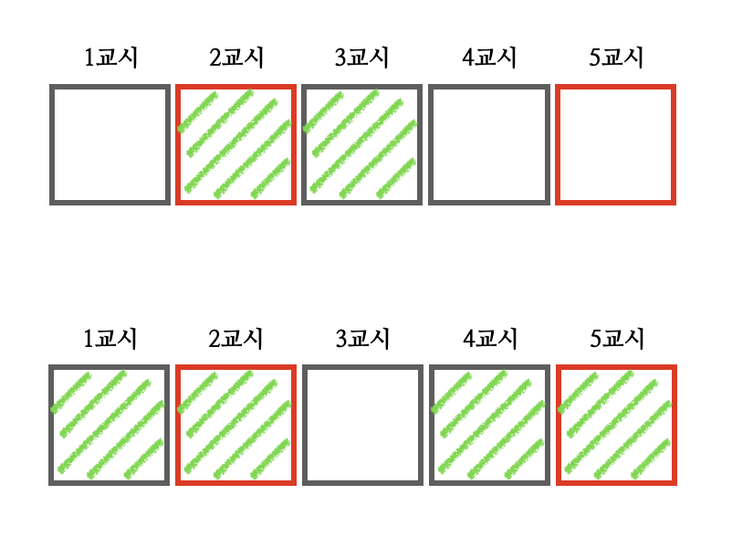 두 경우 모두 가장 많이 연속된 수업들이 정확히 $2$교시를 이룬다.