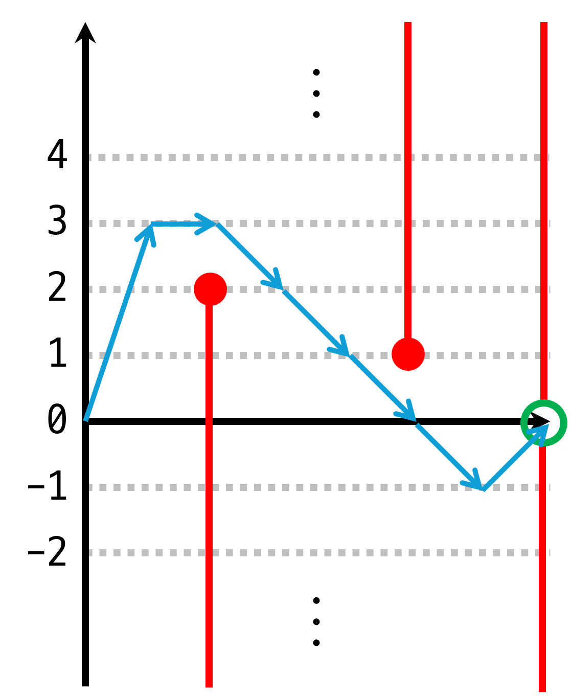 파리가 이동할 수 있는 영역을 좌표평면으로 나타내면 파리의 초기 위치는 $(0,0)$이고 출구는 $(N,0)$에 위치해 있다. 파리의 현재 위치를 $(c_{x},c_{y})$라고 할 때, 파리는 각 이동마다 $-1$ 이상의 정수 $a$를 선택하여 $(c_{x}+1,c_{y}+a)$까지 직선 경로를 따라 이동한다. 파리는 다음과 같이 위아래에서 솟은 끈끈이주걱들을 피하며 $N$번의 이동 후 출구에 도달하고 싶다.