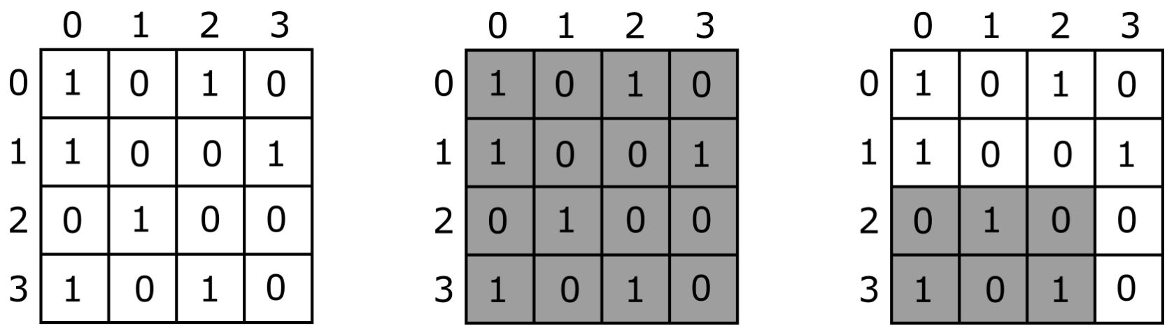 Salma plans to colour a clay mosaic on a wall. The mosaic is an $N \times N$ grid, made of $N$ initially uncoloured $1 \times 1$ square tiles. The rows of the mosaic are numbered from $0$ to $N - 1$ from top to bottom, and the columns are numbered from $0$ to $N - 1$ from left to right. The tile in row $i$ and column $j$ ($0 ≤ i < N$, $0 ≤ j < N$) is denoted by $(i, j)$. Each tile must be coloured either white (denoted by $0$) or black (denoted by $1$).