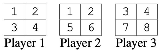 Formally, there are $n$ players, each receiving a (possibly) different sheet of $k$ (not necessarily distinct) numbers. Player $1$ is faster to react than player $2$, who in turn is faster than player $3$, and so on, with player $n$ being the slowest. Consider the following example, corresponding to the first sample input, where three players receive four numbers each: