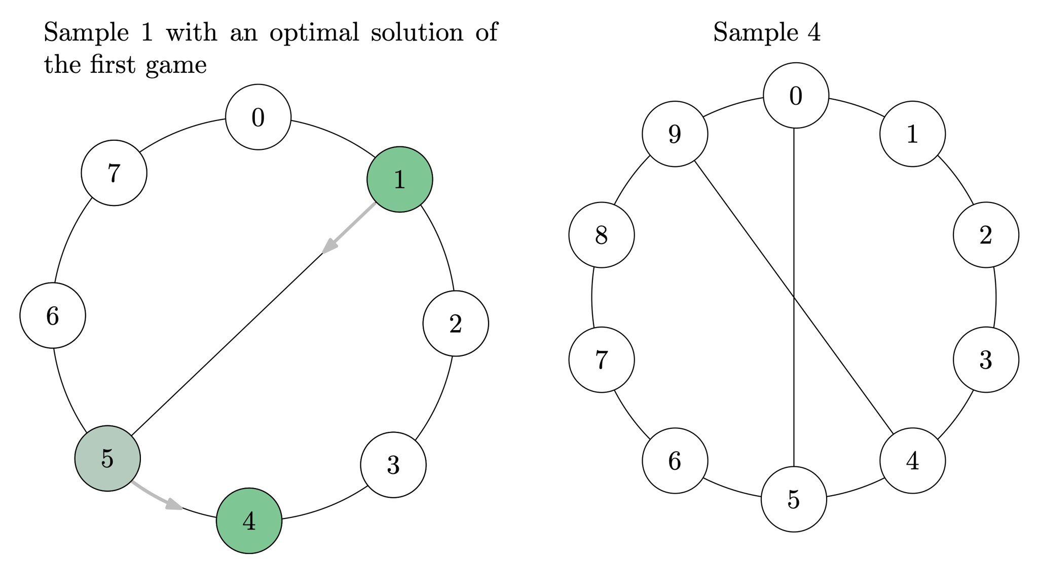The teacher arranges all of the students in a circle, consecutively assigning each student a number from $0$ to $2N - 1$. More specifically, for each $0 \leq i < 2N - 1$, students $i$ and $i + 1$ stand next to each other. Additionally, students $0$ and $2N - 1$ stand next to each other.