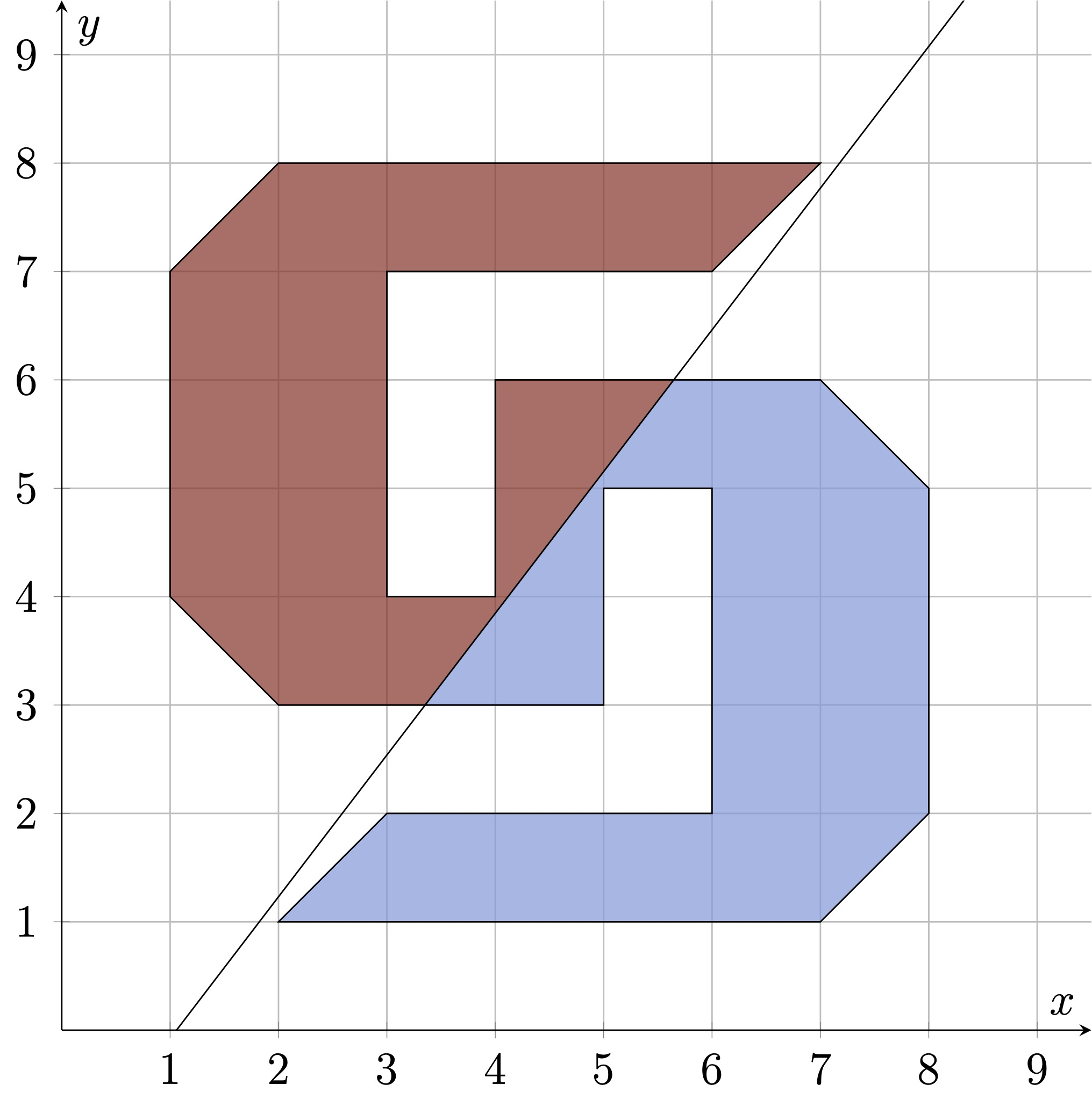 Figure F.1: Visualization of Sample Input 2. The swirly cake looking like an S can be cut into the red and blue part with a single cut.
