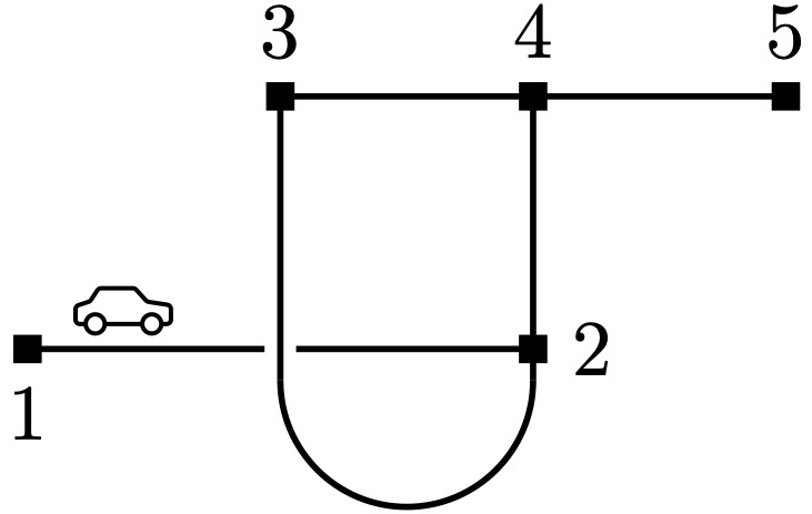 The road network consists of intersections with roads between them. Roads always start and end in one of the four cardinal directions: north, east, south, or west. Furthermore, they never start and end at the same intersection. As an example, consider sample cases 1 through 3, visualized in Figure B.1. These samples only differ in their value of $k$.