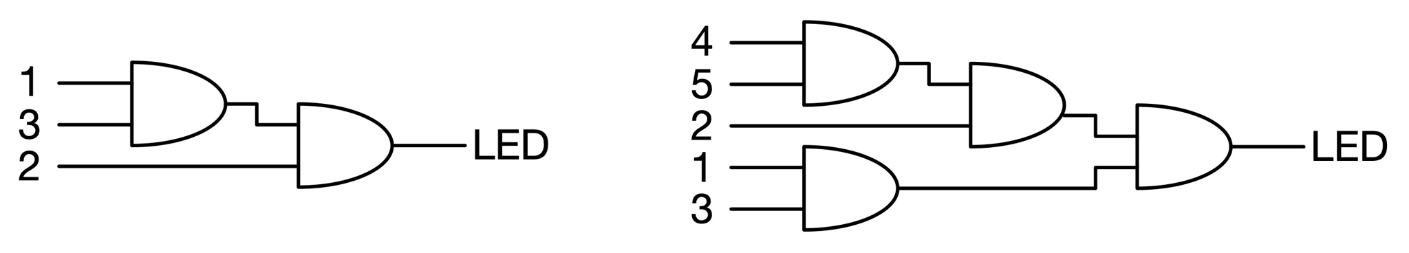 AND gates in the circuit where $N$ is the number of source signals.AND gate.AND gate in the circuit is connected to precisely one signal, which will either be one of the source signals or will be the output signal of another AND gate.AND gate will never reach one of its own input wires.Finally, the output of your circuit will be connected to an LED which will be used to indicate if this signal is True or False. So the LED will illuminate if and only if all source signals are True.