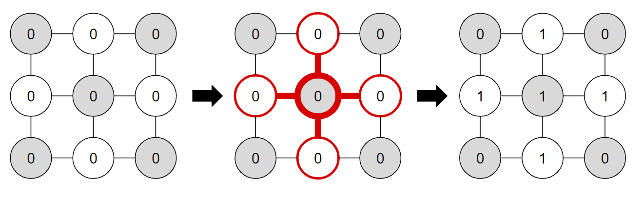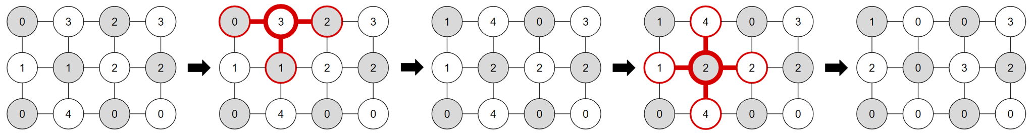 The $i$-th of the next $n$ lines contains $m$ integers describing the $i$-th row of the combination. The $j$-th of these is $a_{ij}$, the desired position of the dial at position $(i, j)$. If $i+j$ is even, $0 \le a_{ij} < 3$. Otherwise, $0 \le a_{ij} < 5$.