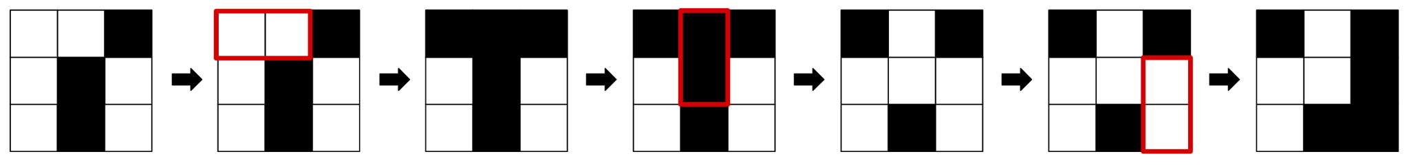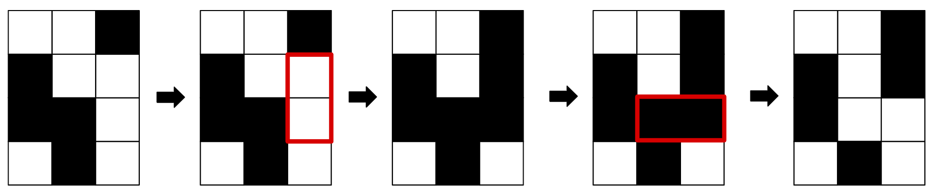 You are also given a target grid of $n$ by $m$ black and white squares. Perform at most $200nm$ operations on the starting grid to reach the target grid, or state that it is impossible to do so. You do not need to minimize the number of operations.