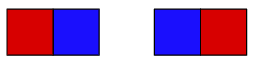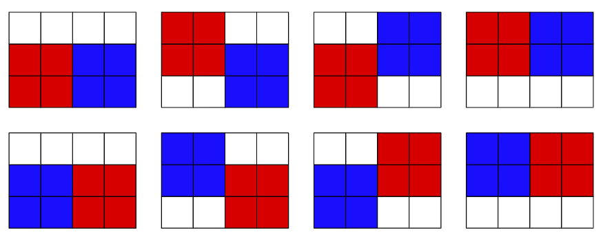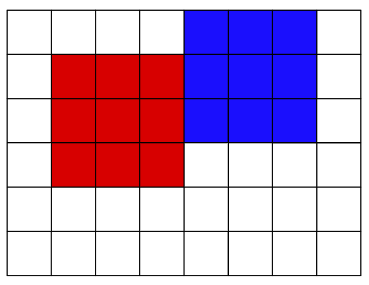 There is an $n$ by $m$ grid of white squares. You want to place a $k$ by $k$ red square and a $k$ by $k$ blue square on this grid such that they do not overlap. For example, here is a valid solution for $n=6$, $m=8$, $k=3$: