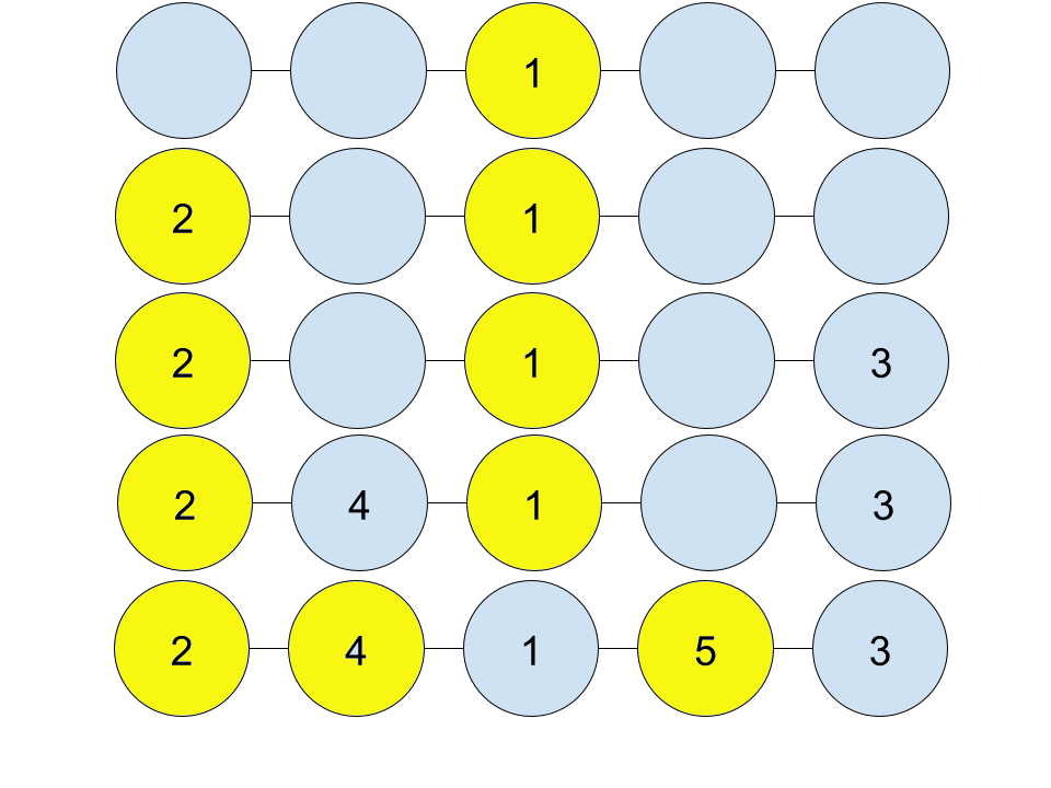 An example of the process for the first tree is shown below. The yellow nodes are one potential longest increasing tree subsequence after each operation. The node's labels are 1-5 from left to right, initially with blank values.