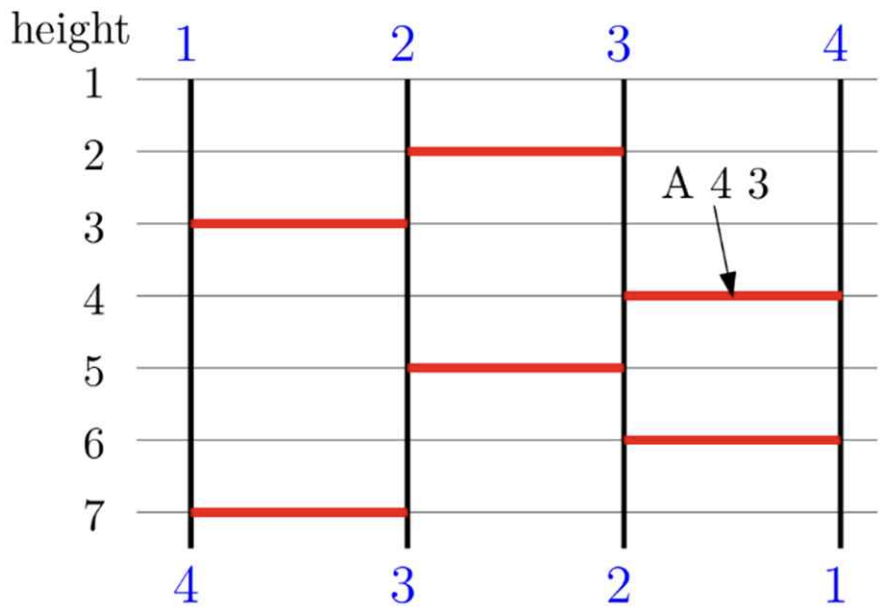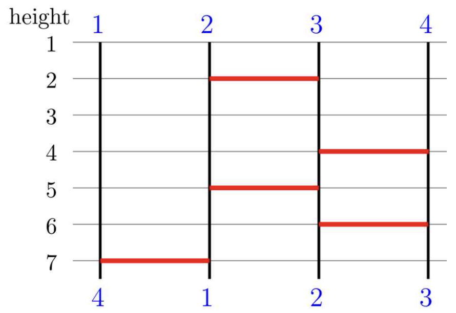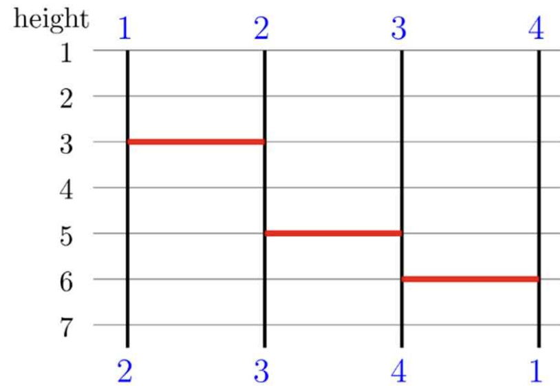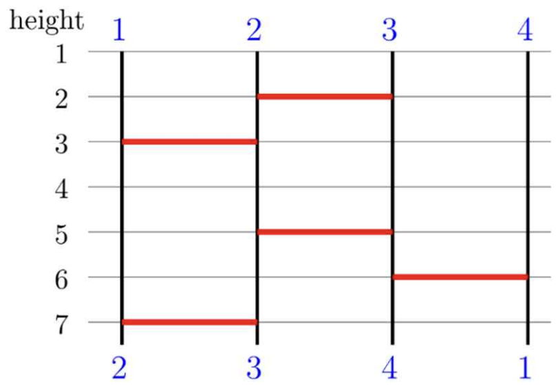 The vertical lines are numbered from $1$ to $n$ from left to right. It is well known that the game result is a permutation of $[1, 2, \dots , n]$. For example, given a diagram with $4$ vertical lines and $5$ legs shown below, the game result is $[2, 3, 4, 1]$ from left to right.