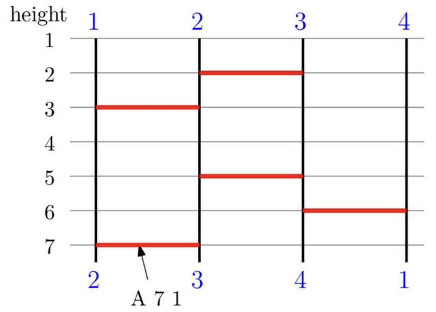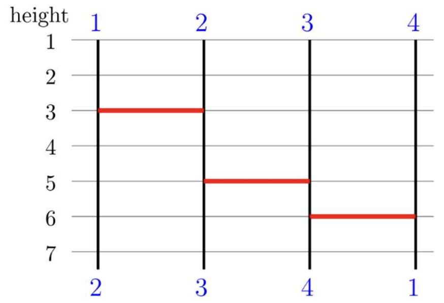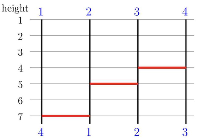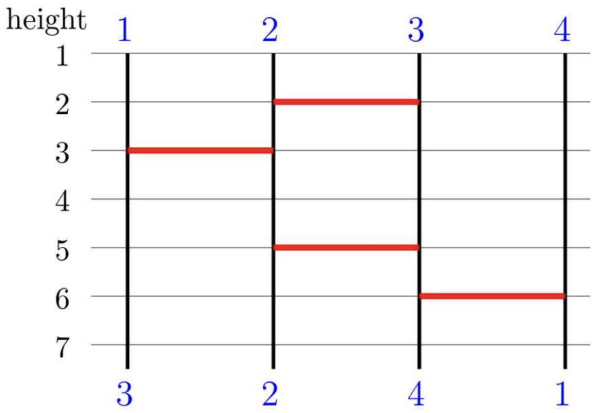 However, some legs are redundant, meaning that the same result $[2, 3, 4, 1]$ can be achieved with fewer legs; as in the figure below, one can obtain the same result only with three legs excluding topmost and bottommost ones. We want to determine the minimum number of horizontal line segments (legs) needed to achieve the same result. Note that it is possible to draw new legs than the given ones if necessary.
