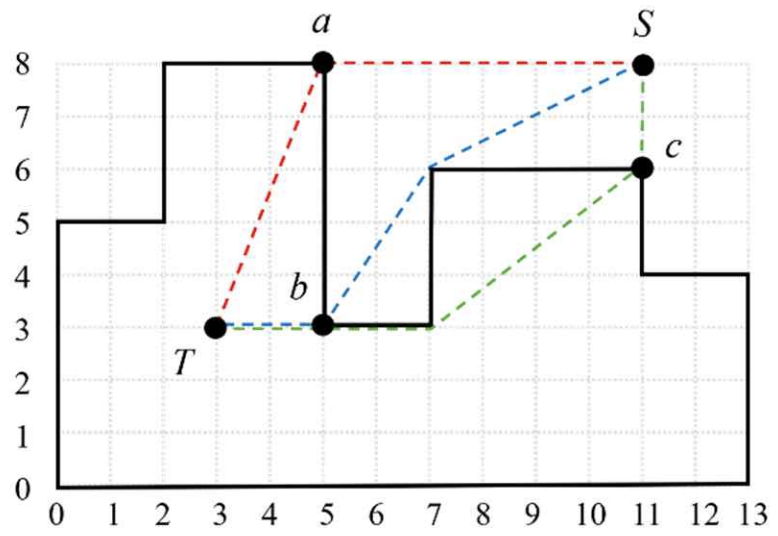 Figure E.1 illustrates a mausoleum along with several possible paths from $S$ to $T$, where the vertices are pierced only once. The path through vertex $a$ has a total length of $11.385165 = 6 + \sqrt{29}$, the path through vertex $b$ has a length of $10.077687 = \sqrt{20} + \sqrt{13} + 2$, and the path through vertex $c$ has a length of $11.0 =2 + \sqrt{25} + 4$. Among these, the shortest path is through vertex $b$.
