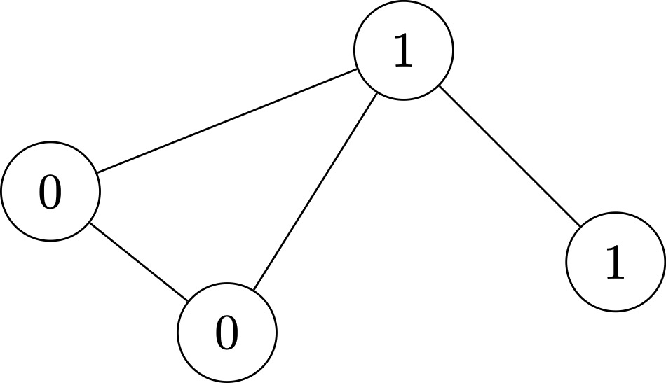 You are given an undirected graph with $n$ vertices and $m$ edges. Each vertex $v$ has a number $a_v$ written on it. This number is either $0$ or $1$. A walk is a sequence $v_1v_2 \dots v_k$ of vertices in the graph such that any two consecutive vertices are connected by an edge. We call a binary sequence $$s = s_1s_2 \dots s_k$$ walkable if there is a walk $v_1v_2 \dots v_k$ in the graph that satisfies $a_{v_1} a_{v_2} \dots a_{v_k} = s$.
