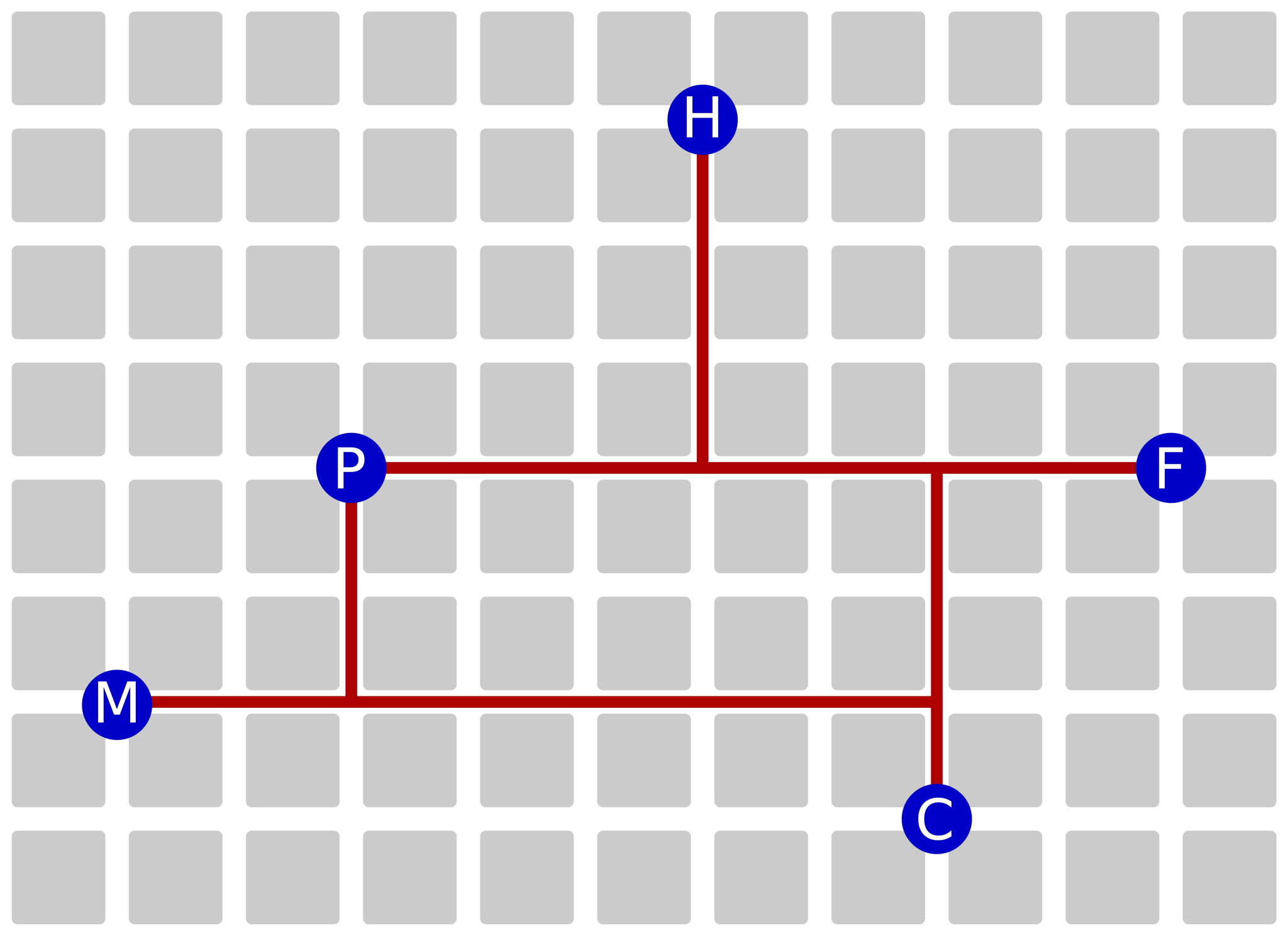 Figure C.1: Illustration of Sample Input 1, with the locations labelled by their initial letters, and a possible way of refurbishing the minimum number of road segments ($22$). The point $(0,0)$ is located at the bottom-left corner of the grid.