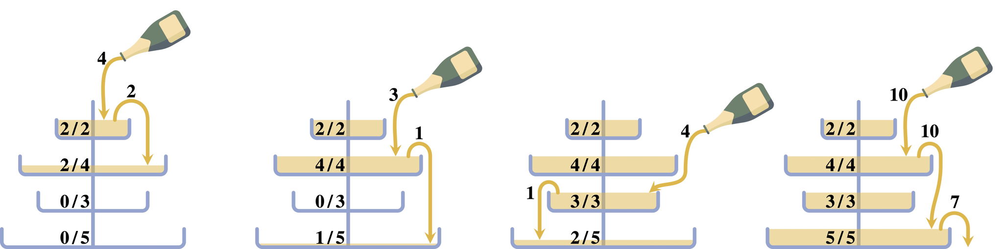 Last week, Bill filled a champagne fountain for the first time. Delighted by the champagne pouring from one glass into another, he decided that he wants to organize an even bigger champagne fountain for the next World Finals. He already ordered $n$ glass bowls with different capacities to stack on top of each other to form a huge glass fountain. However, he is still unsure how to pour the champagne into the fountain. One bottle will not be enough and just pouring from the top might not fill every bowl. Bill wants to try out different ways to fill the fountain, but wasting any champagne would be such a shame.