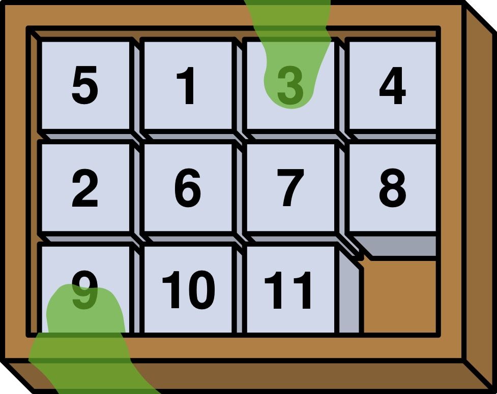 | Figure G.1: Example of a 3-by-4 sliding puzzle, corresponding to Sample Input 1. | Figure G.2: The sliding puzzle of Figure G.1 after solving. | Figure G.3: Example of a sliding puzzle with glued tiles, covered in green goo. This example is possible to solve, corresponding to Sample Input 3. |