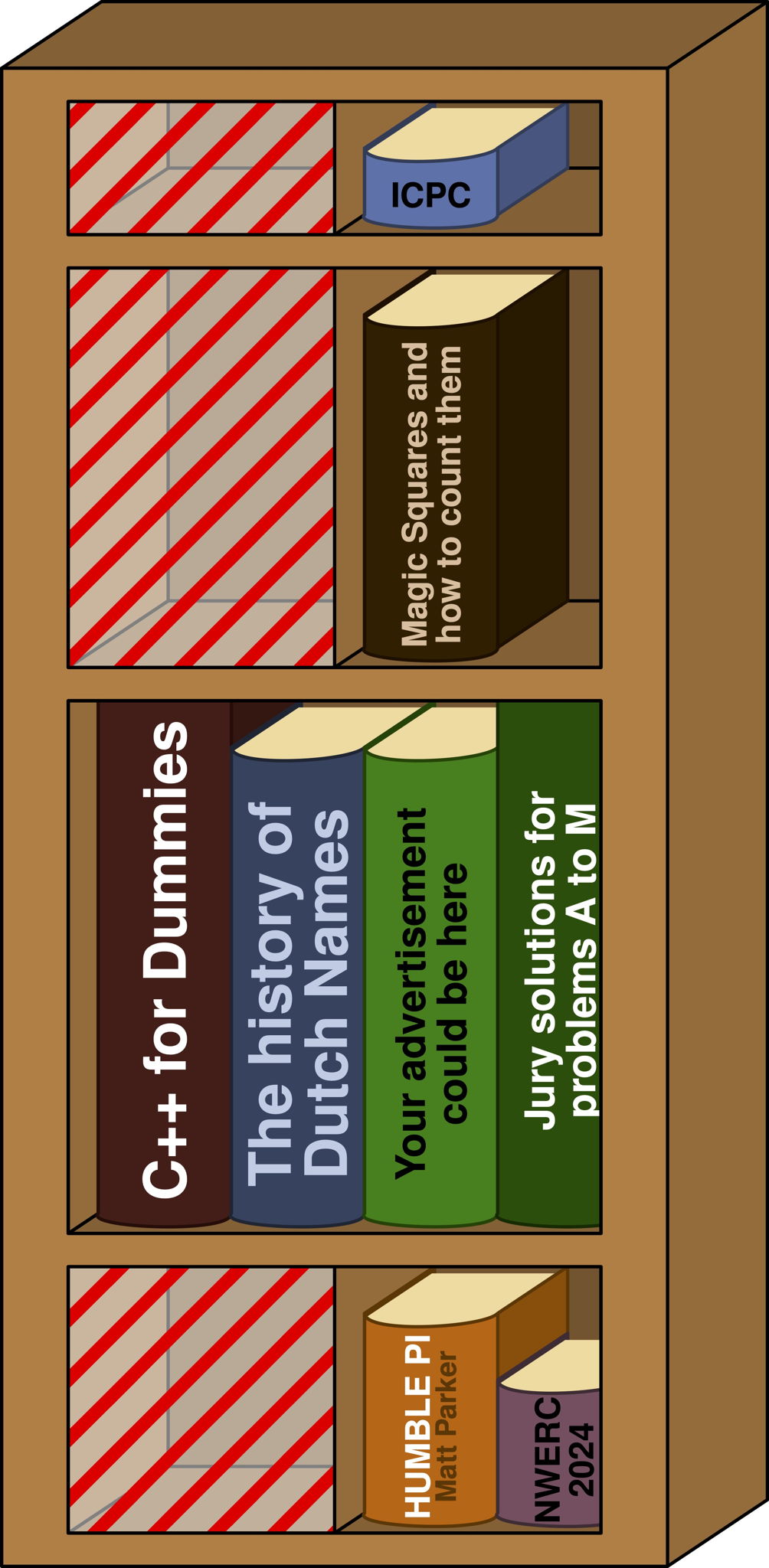 Figure L.1: Illustration of Sample Input 1. Three shelves can have art pieces in the hatched areas, while still fitting all new books.