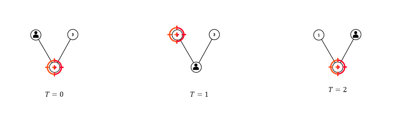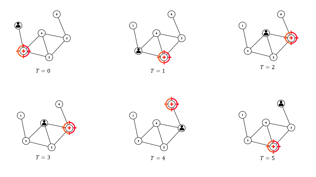 위 그림은 건우가 출발지에서 출발해서 목적지에 도착하기까지의 과정을 나타낸 그림이다. 검은 사람 모양이 있는 교차점은 현재 건우가 자리 잡고 있는 교차점을 의미하며, 빨간 표적 무늬가 있는 교차점은 현재 감시받고 있는 교차점이다.