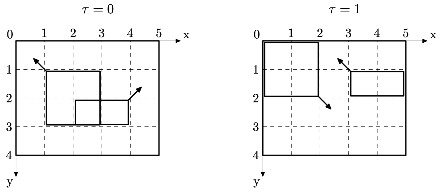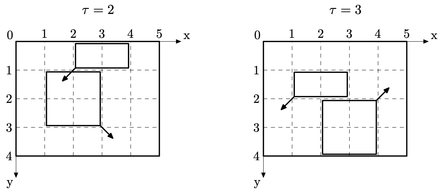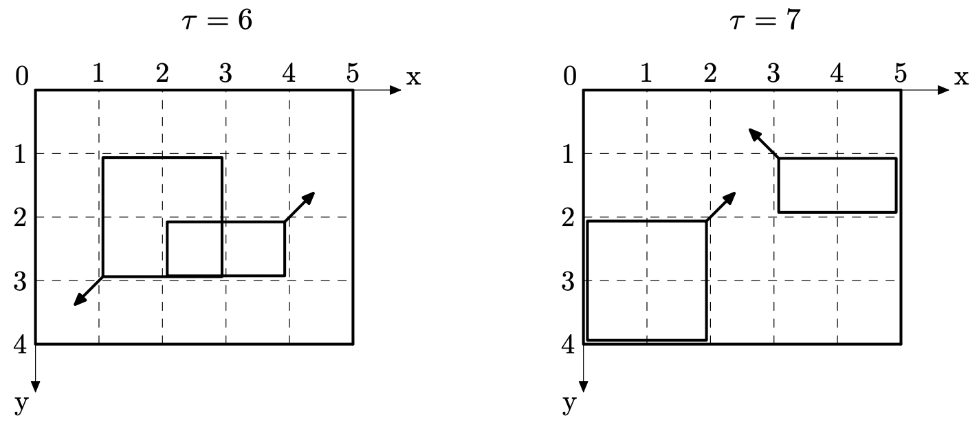 As a result of the above, both rectangles stay fully within the screen at all times. Informally, collisions of the rectangles with the screen borders are perfectly elastic. Note, however, that rectangle movement is still discrete: each rectangle moves instantly by $1$ pixel in both directions at the end of each second.