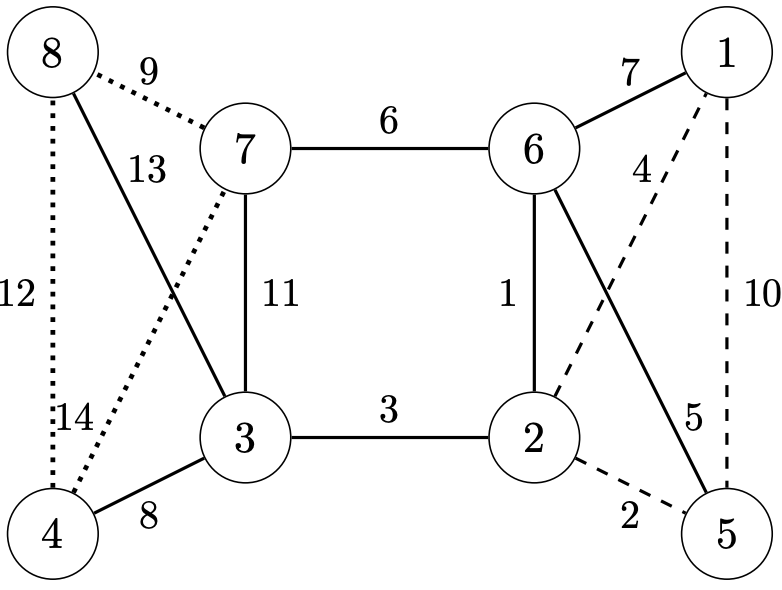 As an example, consider the illustration above, which corresponds to the first sample. The roads highlighted with dotted lines ($14$, $9$ and $12$) indicate the chosen competition track. This track forms a closed loop, visiting three different cities ($4$, $7$ and $8$). Note that it remains possible to travel between any pair of cities using the remaining roads. Additionally, another possible track is shown with dashed lines, illustrating that the solution is not unique.