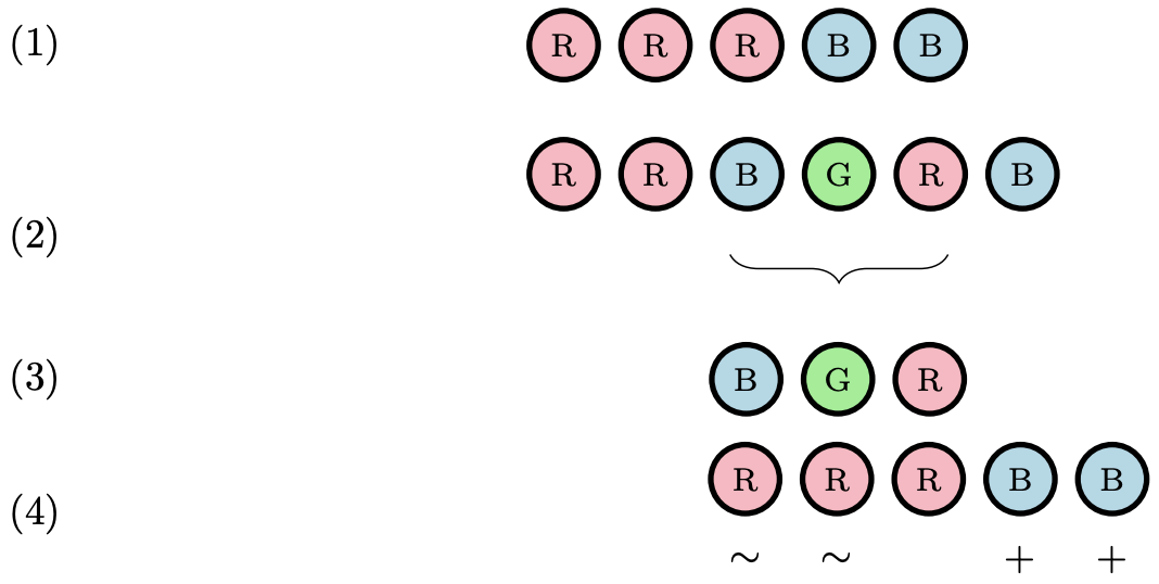 As an example, for $R = 3$ and $B = 2$, consider the picture above. At the top of the picture is Cindy’s original $(3, 2)$-sequence (1). Below that is the sequence $S$ after Grinch’s attack (2). A possible contiguous subsequence with $L = 3$ and $U = 5$ follows (3). Finally, a way to transform the subsequence into a $(3, 2)$-sequence using four operations is shown, replacing the first two balls with red balls and adding two blue balls at the end (4). Four is the minimum number of operations required for this contiguous subsequence.