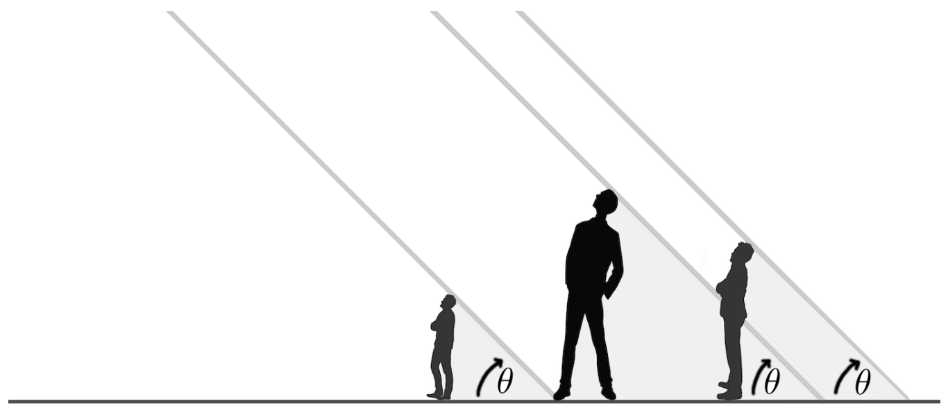 In this world, there is a perfectly straight, infinite road that runs along the $x$-axis. Instead of a sun, they have something more illuminating: a gigantic flashlight elevated above the road, positioned infinitely far away to the west (negative $x$-axis). This flashlight beams light at a precise angle with respect to the ground, illuminating the entire road.
