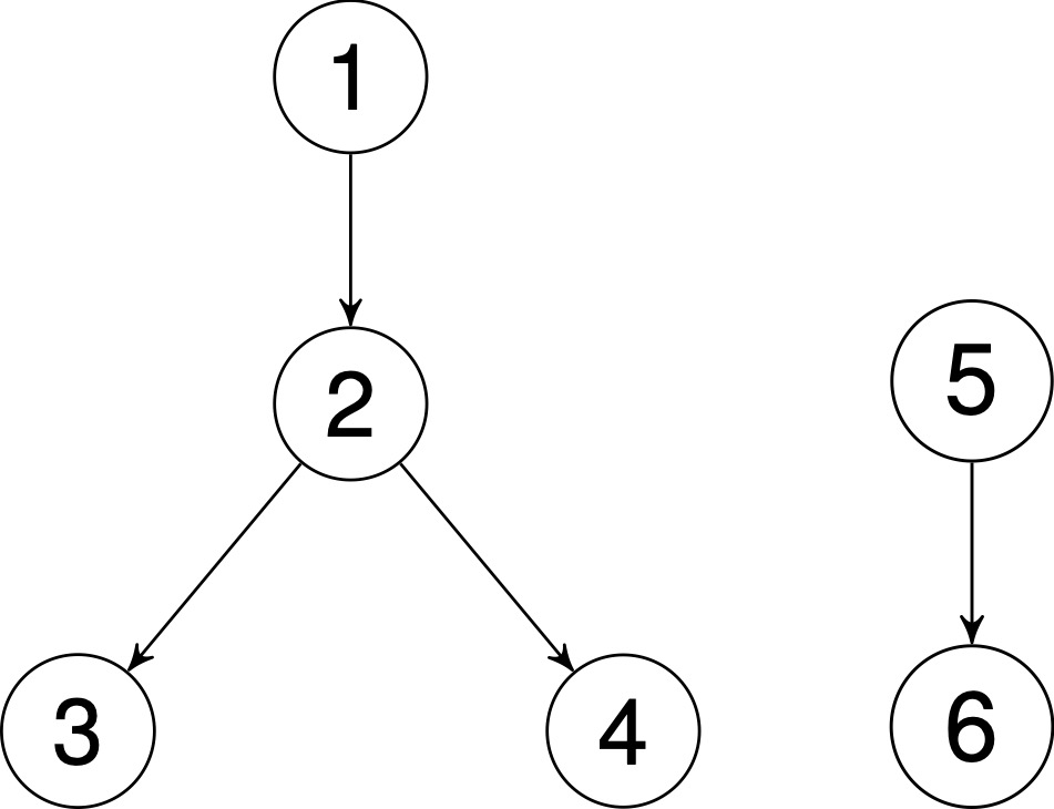 Figure F.2: The paths in the forest of the second sample input. Forrest will have to run the following paths: $1-2-3-2-1-2-4-2-1$ and $5-6-5$.