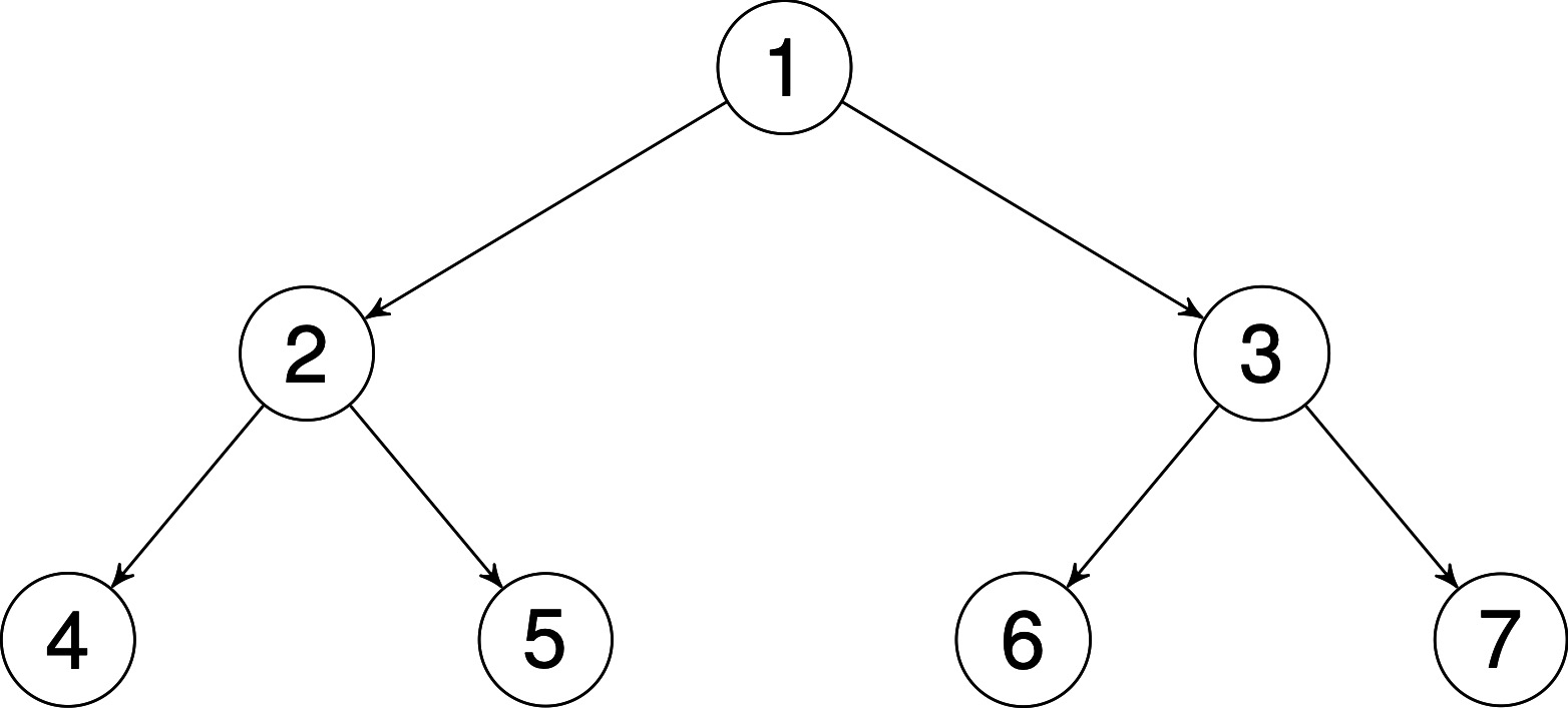 Figure F.1: The paths in the forest of the first sample input. Forrest will have to run the following path: $1-2-4-2-1-2-5-2-1-3-6-3-1-3-7-3-1$.