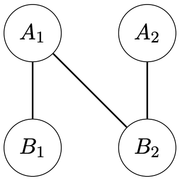 $0$번 다리를 지은 이후, 모든 다리는 직전에 지은 다리와 인접한 위치에 건설되었다. 구체적으로, 모든 $0 \leq i \leq 2N-3$ 에 대해서, 만약 $i$번 다리가 $A_x$ 마을과 $B_y$ 마을을 잇는다면, $i + 1$번 다리는 $A_x$ 마을과 $B_{y + 1}$ 마을을 잇거나, $A_{x + 1}$ 마을과 $B_y$ 마을을 잇는다. 두 경우 중 어떤 것이 결정되었는지는 길이 $2N-2$의 문자열 $S$에 기록되어 있다. 만약 $S[i] =$ 'A' 일 경우 $i+1$번 다리는 $A_x$ 마을과 $B_{y+1}$ 마을을 이으며, $S[i] = $'B' 일 경우 $i+1$번 다리는 $A_{x + 1}$ 마을과 $B_y$ 마을을 잇는다. $S$ 에는 정확히 $N-1$개의 'A'와 $N-1$개의 'B' 가 등장한다. 이에 따라 다음과 같은 사실이 성립함을 증명할 수 있다: