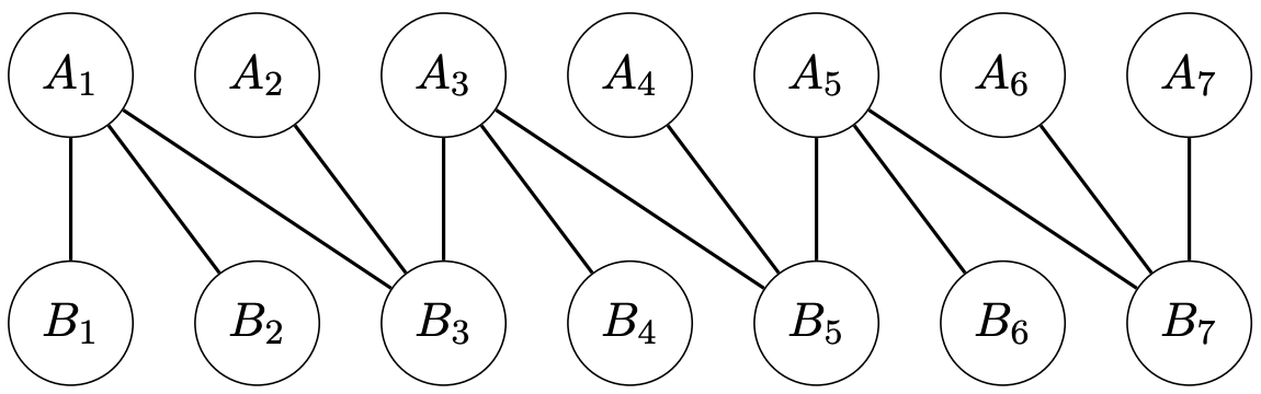 KOI 도시는 도시를 동서로 가로지르는 큰 강을 중심으로 형성되어 있다. 강의 북쪽과 남쪽에는 각각 $N$개의 마을이 위치해 있다. 북쪽의 마을들은 하류에서부터 순서대로 $A_1, A_2, \ldots, A_N$ 과 같이 식별되며, 남쪽의 마을들은 하류에서부터 순서대로 $B_1, B_2, \ldots, B_N$ 과 같이 식별된다. 고로, KOI 도시에는 총 $2N$개의 마을이 존재한다.