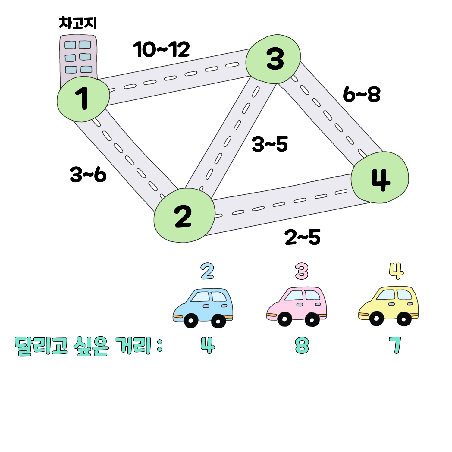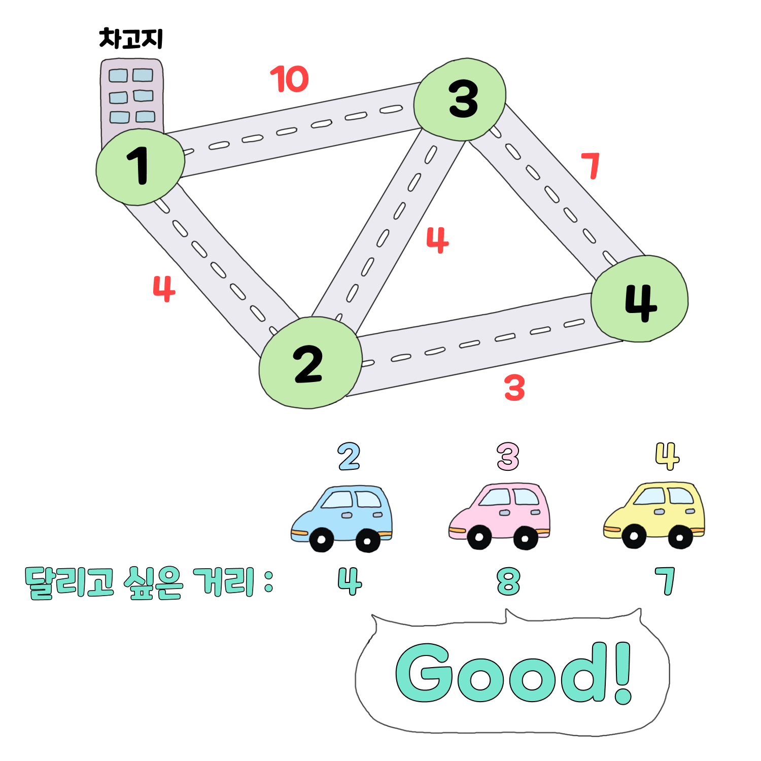 도로의 길이를 오른쪽 그림과 같이 설정하면, $2$, $3$, $4$번 차는 각각 $4$, $8$, $7$만큼의 거리를 주행하게 되고, 이는 조건을 만족하도록 도로의 길이를 정하는 방법 중 하나이다.