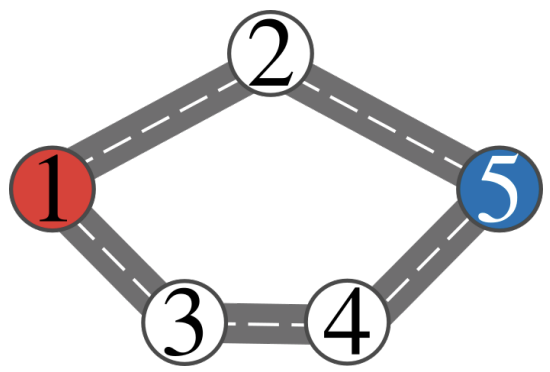 Note that the optimal strategy for the police is to wait until the supporters’ club is on a vertex adjacent to the destination (i.e., vertex $5$) and then block the edge that connects that vertex to the destination. The optimal strategy for the supporters’ club is to follow the upper path (by going from $1$ to $2$) and then after seeing the edge between $2$ and $5$ get blocked, they will go around by following $2$ back to $1$ and then following the lower path ($1$ to $3$ to $4$ to $5$). The number of traversed roads in this case is $5$.