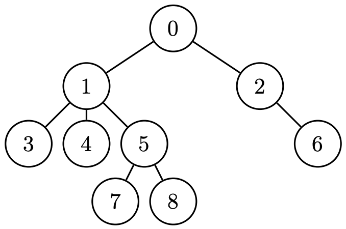예를 들어, 아래 그림은 탄생 번호가 0인 생명체가 진화해 탄생 번호가 1, 2인 생명체가 탄생하고, 탄생 번호가 1인 생명체가 진화해 탄생 번호가 3, 4, 5인 생명체가 탄생하고, 탄생 번호가 2인 생명체가 진화해 탄생 번호가 6인 생명체가 탄생하고, 탄생 번호가 5인 생명체가 진화해 탄생 번호가 7, 8인 생명체가 탄생하는 과정을 표현한 진화 트리이다. 아래 그림에서 트리의 각 정점에는 해당하는 생명체의 탄생 번호가 적혀 있다.