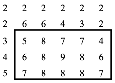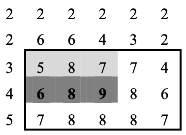 Squad commander is looking for a location to build a camouflaged camp of a certain size. He has a digital topographic map of the area, which is a rectangular grid with every element defining the altitude at a certain coordinate. Coordinates of any point on the map are identified by the row and the column in the table.