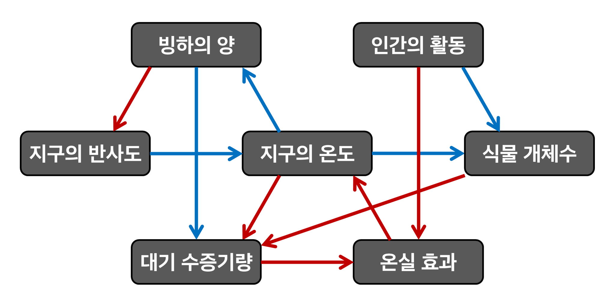 지구과학을 공부하다보면, 위와 같은 도표를 가끔 발견할 수 있습니다. 위 그림은 "인과지도"라고 하며, 지구 시스템을 이루는 여러 변수들을 시각화하기 위한 도표입니다.