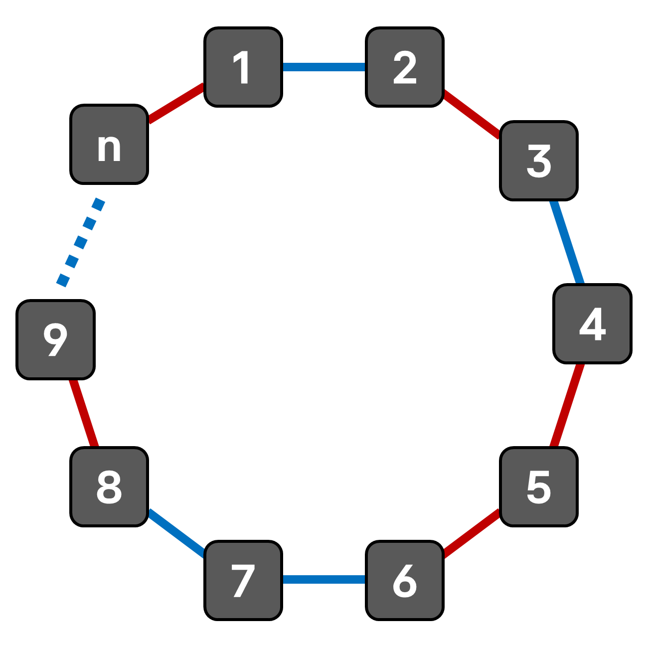지구과학 수업 시작 전, 학생들은 강의실 칠판에 $N$개의 가상의 변수가 하나의 거대한 "피드백 루프"를 구성하는 인과지도를 그리며 놀았습니다. 편의상 이 거대한 피드백 루프를 이루는 변수들에 시계방향으로 $1$부터 $N$까지의 번호를 붙입니다.