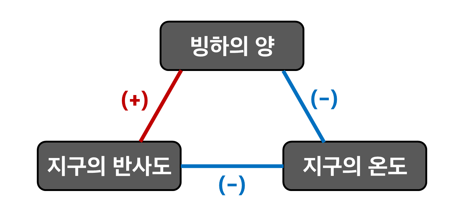 위 그림에서 세 개의 변수, "빙하의 양", "지구의 온도", "지구의 반사도"는 하나의 고리(Cycle)을 이룹니다. 인과지도에서의 고리는 하나의 변수가 변함에 따른 결과가 해당 변수에 다시 영향을 미치는 되먹임(피드백)을 나타내며, 이를 "피드백 루프"라고 부릅니다.