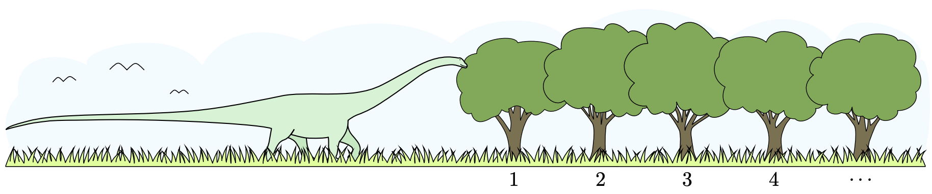 $^∗$Bajtazaur wymyślił sobie, że w jedną stronę będzie jadł tylko z drzew o nieparzystych numerach, a z powrotem będzie jadł tylko z drzew o numerach parzystych. W ten sposób rozłoży posiłki równomiernie na całej trasie.