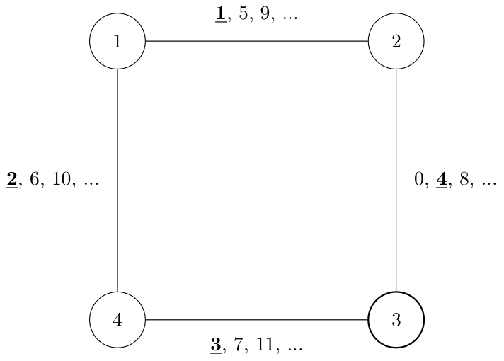 시계 방향으로 이동하면 1번 횡단보도와 2번 횡단보도를 각각 1초, 4초 뒤에 건널 수 있고, 반시계 방향으로 이동하면 4번 횡단보도와 3번 횡단보도를 각각 2초, 3초 뒤에 건널 수 있다. 따라서 반시계 방향으로 이동하는 것이 3번 인도에 더 빠르게 도착할 수 있다.