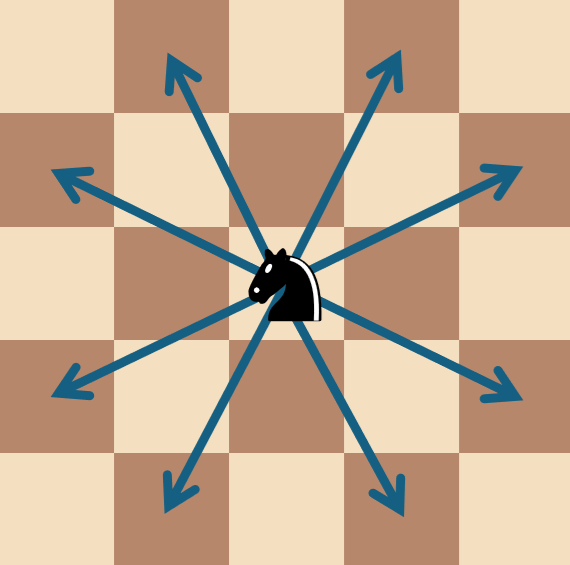 체스에서 나이트는 'L'자 형태로 이동하며, 한 번에 가로로 두 칸 이동 후 세로로 한 칸, 또는 세로로 두 칸 이동 후 가로로 한 칸 이동할 수 있다. 아래는 나이트가 이동할 수 있는 위치를 나타낸 그림이다.