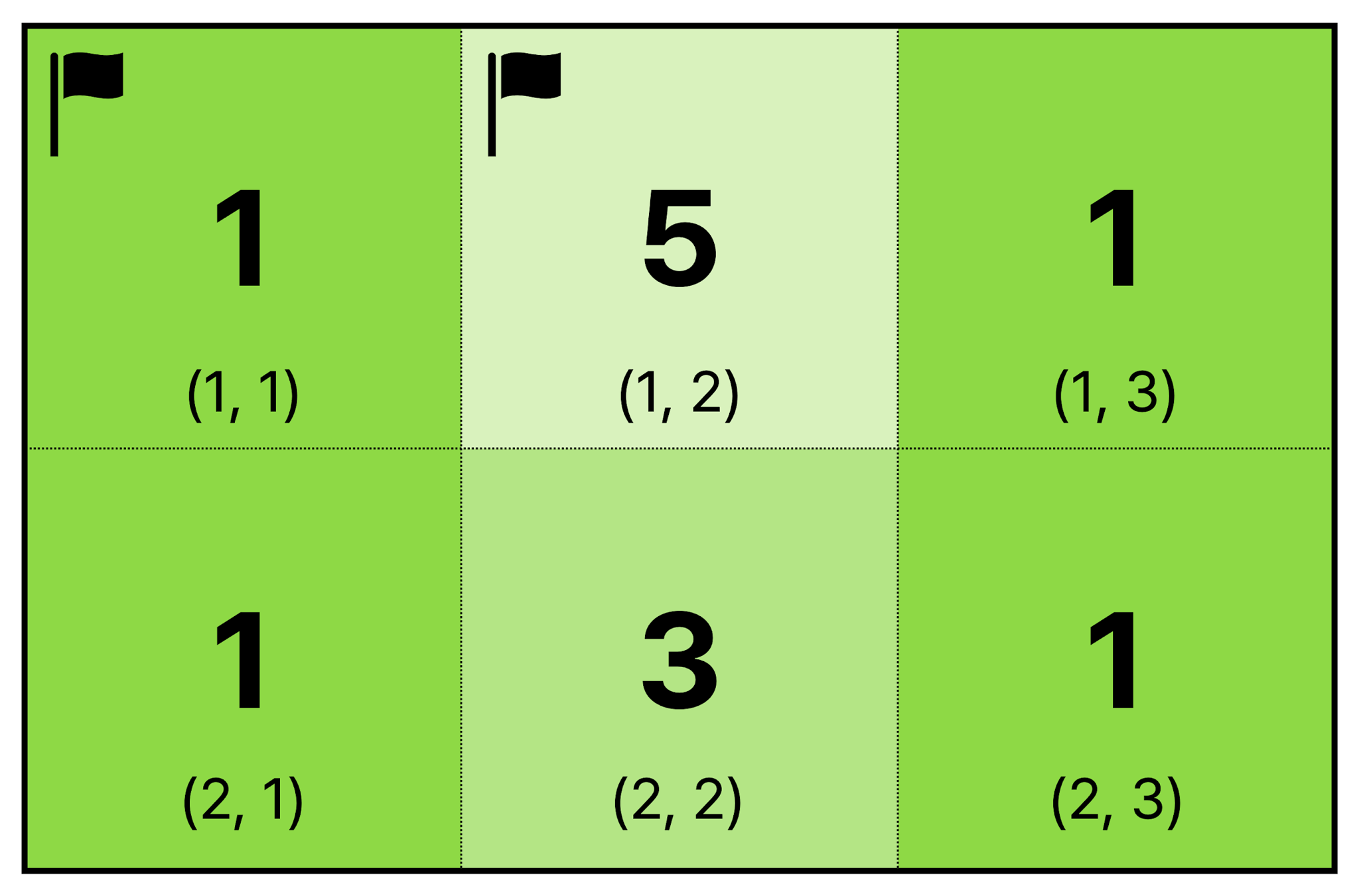 위 그림은 예제 입력 1에서 주어진 지도의 모습이다. 근성은 $(1,1)$에서 등반을 시작하여, $(1,1)$$\rightarrow$$(2,1)$$\rightarrow$$(2,2)$$\rightarrow$$(1,2)$의 경로를 거쳐 최소 시간에 무등산 정상에 도달할 수 있다.