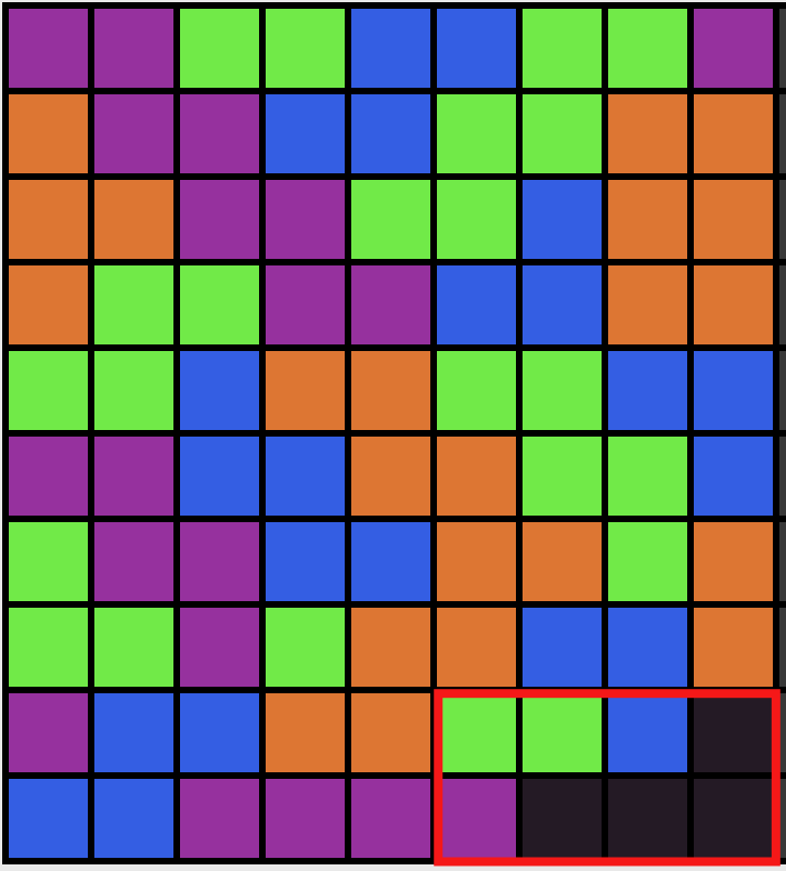 | 2 | 15 | Every connected component of equal values in the grid has size at most $4$. |