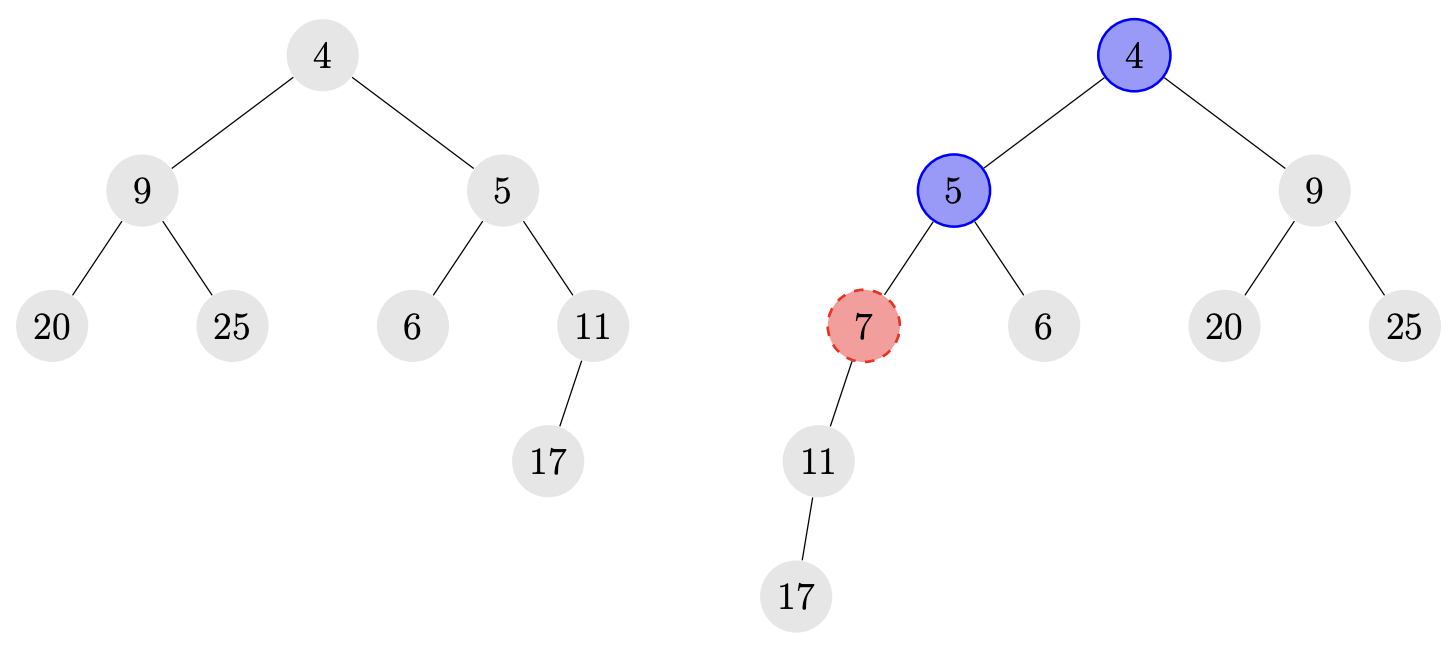 Figure A.1: Example of inserting the value $7$ into a skew heap. The nodes storing $4$ and $5$ (marked in blue) have their children swapped, while the node storing $11$ becomes the left child of the newly inserted node (marked in red).