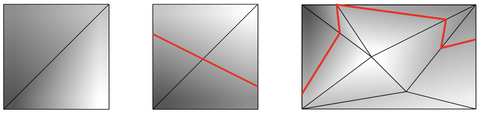 Of course, this map is just a 2D projection of the actual 3D terrain: Every point $(x, y)$ also has an elevation $z$. The elevation at the vertices of the triangulation is directly specified by the map, and all of these given elevations are distinct. The elevation at all other points can be computed by linear interpolation on associated triangles. In other words, the terrain is shaped like a collection of triangular faces joined together by shared sides. These faces correspond to the triangles on the map.